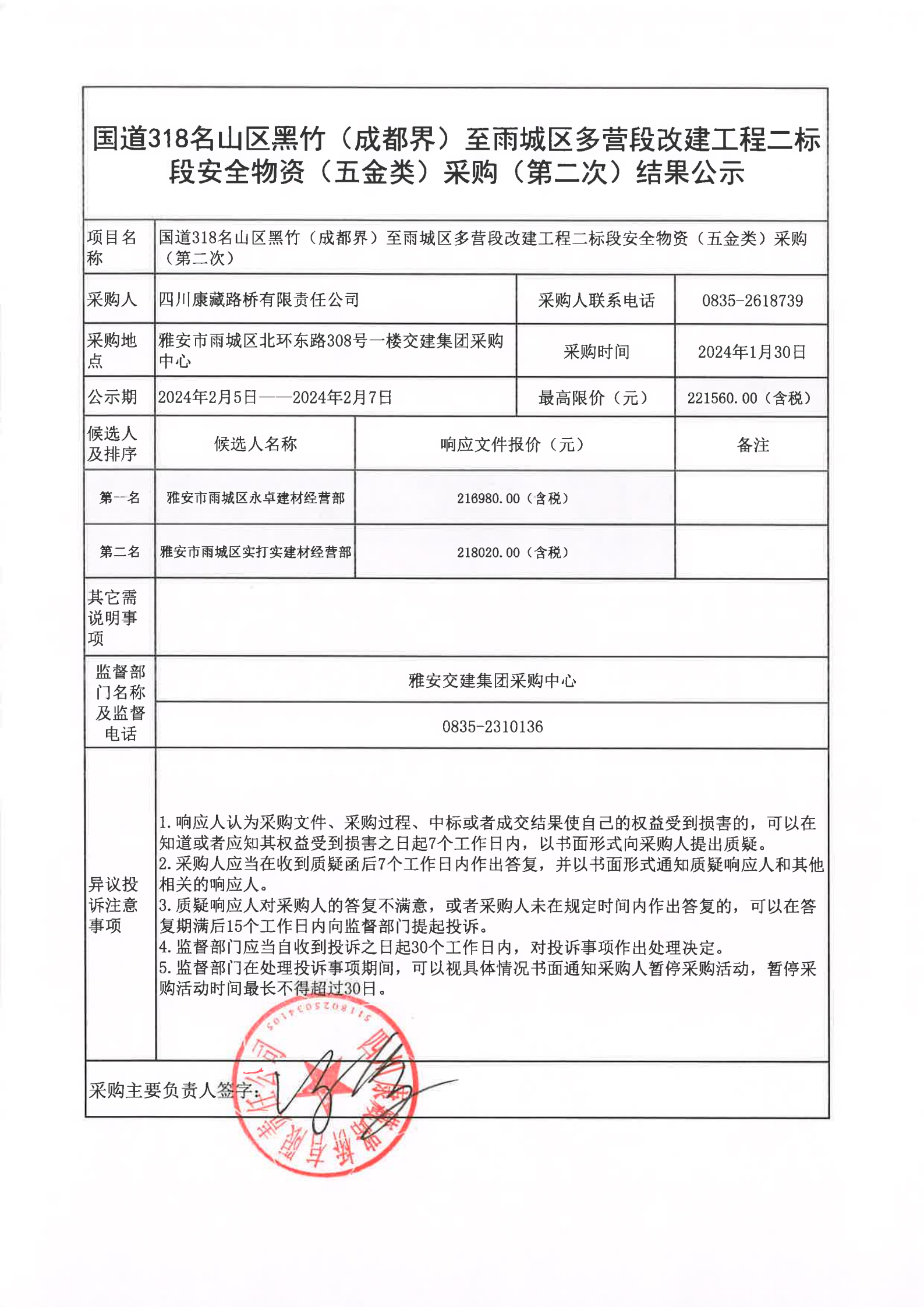 四川康藏路桥有限责任公司国道318名山区黑竹(成都界)至雨城区多营段改建工程二标段安全物资(五金类)采购(第二次)结果公示