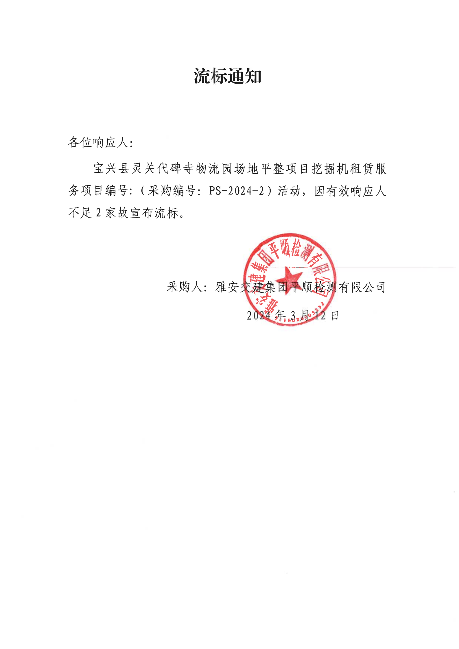 币游集团平顺检测有限公司宝兴县灵关代碑寺物流园场地平整项目挖掘机租赁服务流标通知