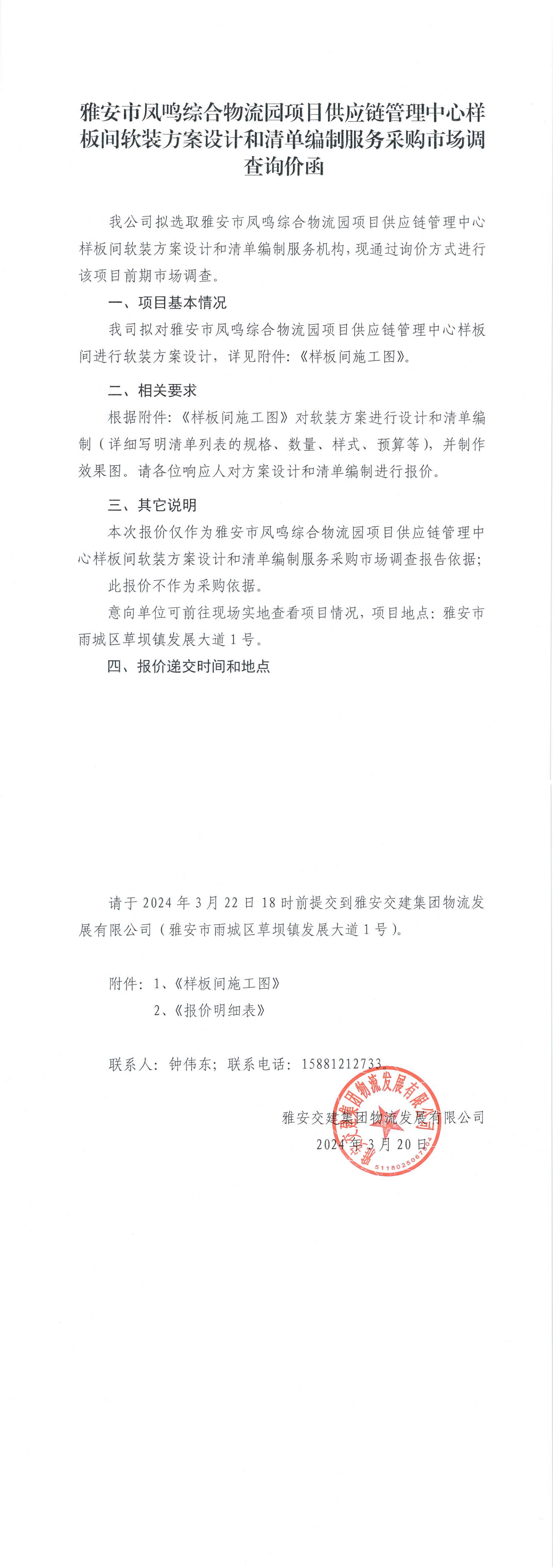 币游集团物流开展有限公司雅安市凤鸣综合物流园项目供应链管理中心样板间软装方案设计和清单编制服务采购市场调查询价函