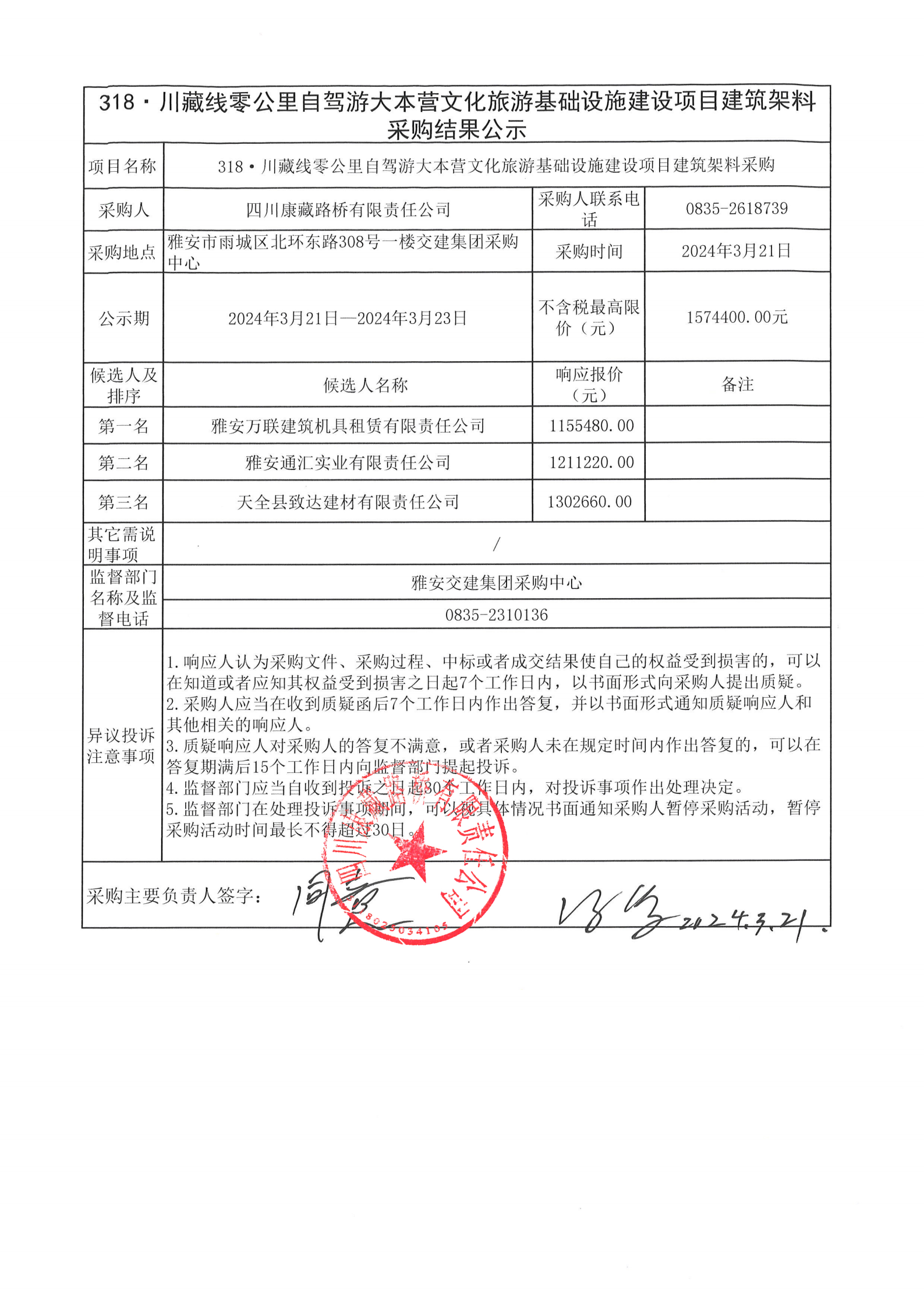 四川康藏路桥有限责任公司318·川藏线零公里自驾游大本营文化旅游基础设施建设项目建筑架料租赁采购结果公示