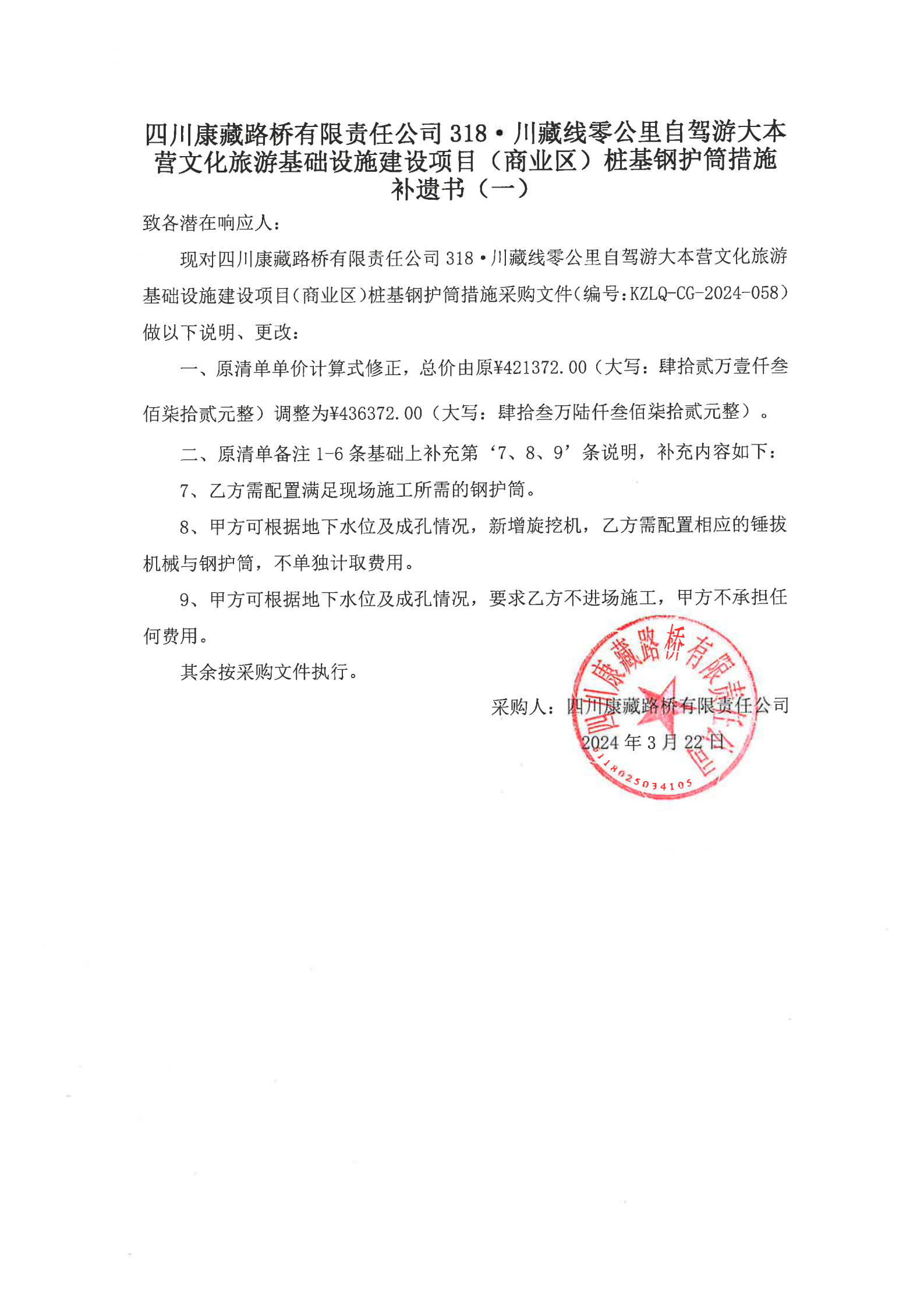 四川康藏路桥有限责任公司318·川藏公路零公里自驾游大本营文化旅游基础设施建设项目(商业区)桩基钢护筒措施补遗书(一)