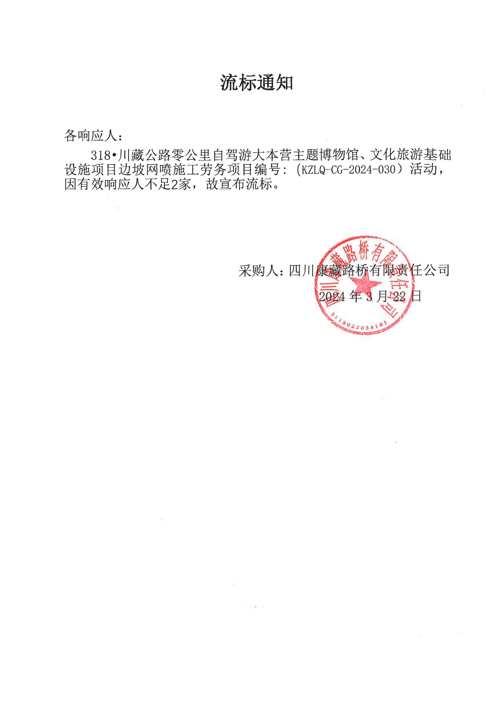 四川康藏路桥有限责任公司318·川藏公路零公里自驾游大本营主题博物馆、文化旅游基础设施项目边坡网喷施工劳务流标通知