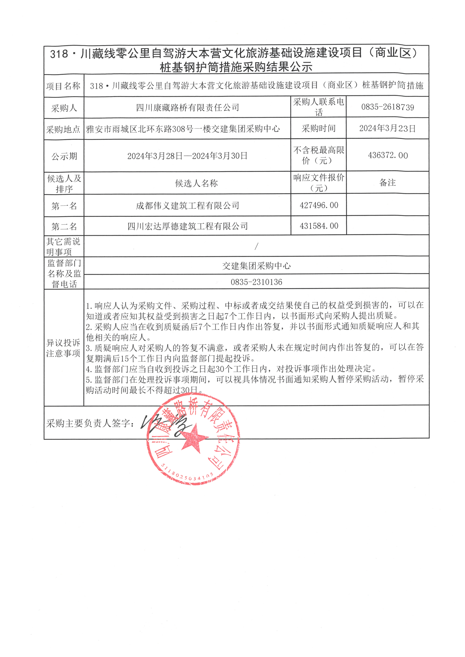 四川康藏路桥有限责任公司318·川藏公路零公里自驾游大本营文化旅游基础设施建设项目(商业区)桩基钢护筒措施采购结果公示