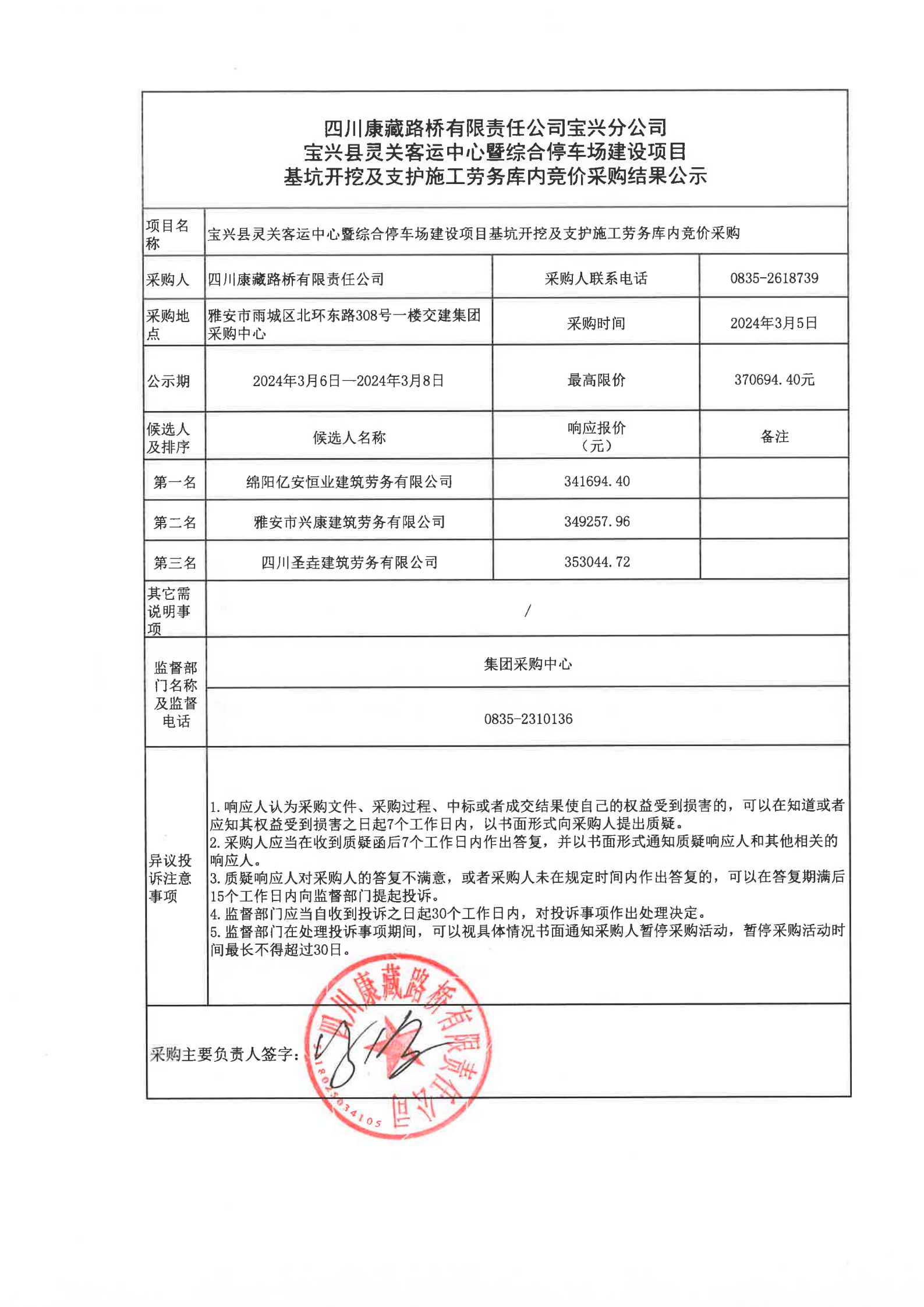 四川康藏路桥有限责任公司宝兴分公司宝兴县灵关客运中心暨综合停车场建设项目基坑开挖及支护施工劳务库内竞价采购结果公示
