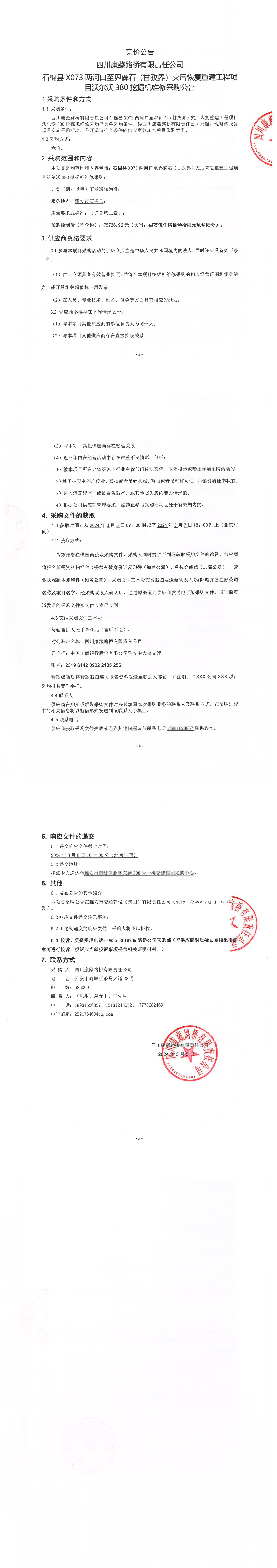 四川康藏路桥有限责任公司石棉县X073两河口至界碑石(甘孜界)灾后恢复重建工程项目沃尔沃380挖掘机维修采购公告