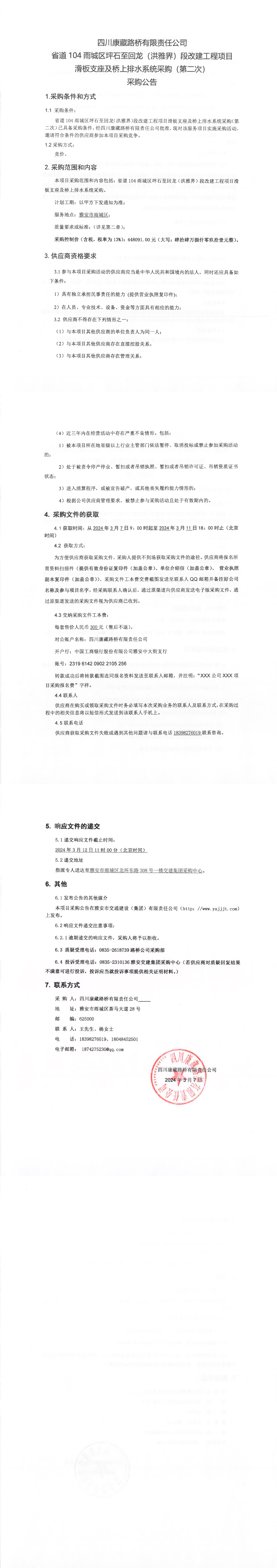 四川康藏路桥有限责任公司省道104雨城区坪石至回龙(洪雅界)段改建工程项目滑板支座及桥上排水系统采购(第二次)采购公告