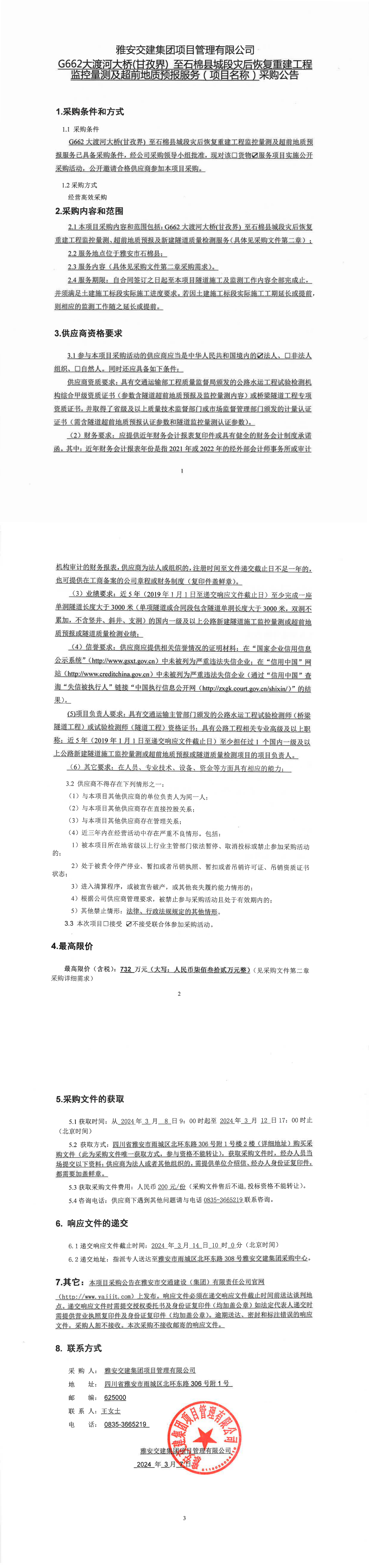 币游集团项目管理有限公司G662大渡河大桥(甘孜界)至石棉县城段灾后恢复重建工程监控量测及超前地质预报服务(项目名称)采购公告