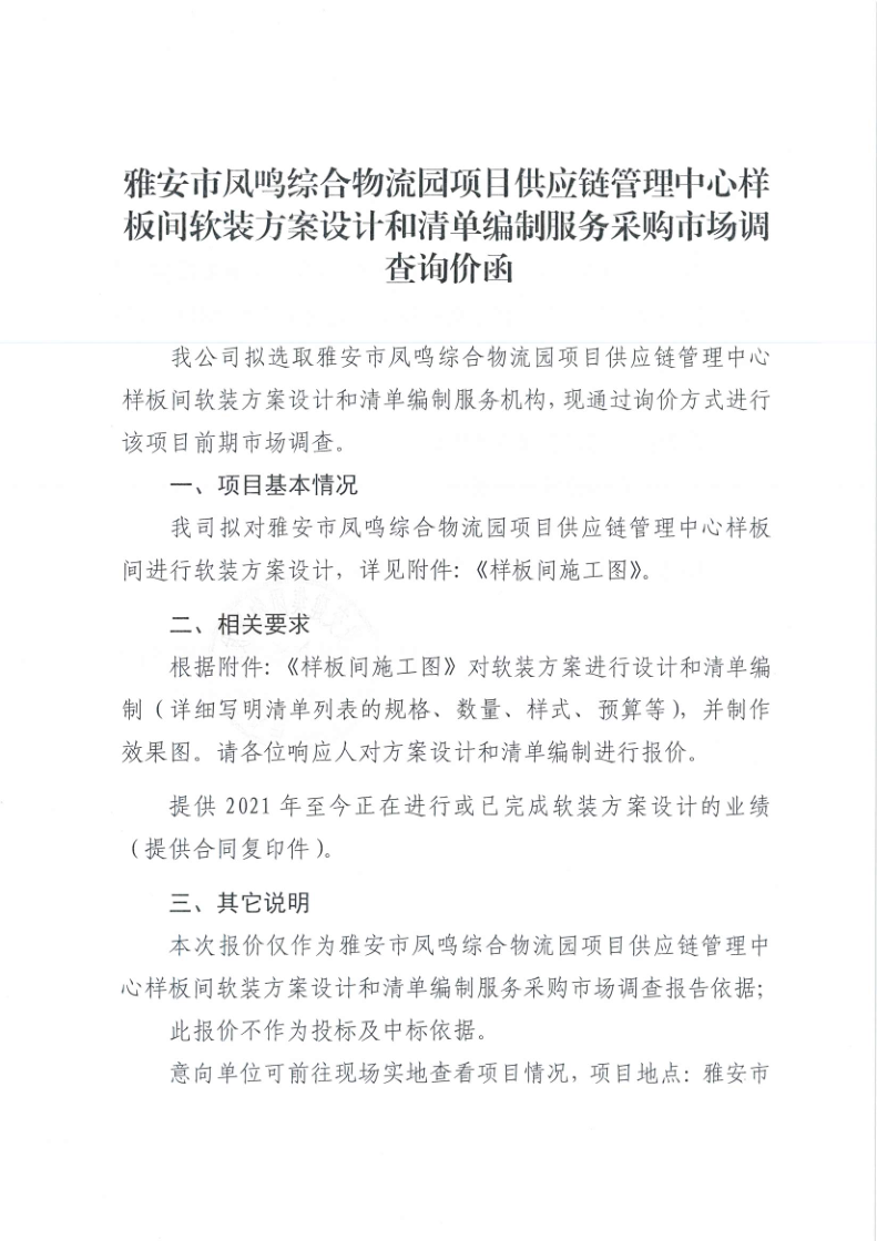 币游集团物流开展有限公司雅安市凤鸣综合物流园项目供应链管理中心样板间软装方案设计和清单编制服务采购市场调查询价函