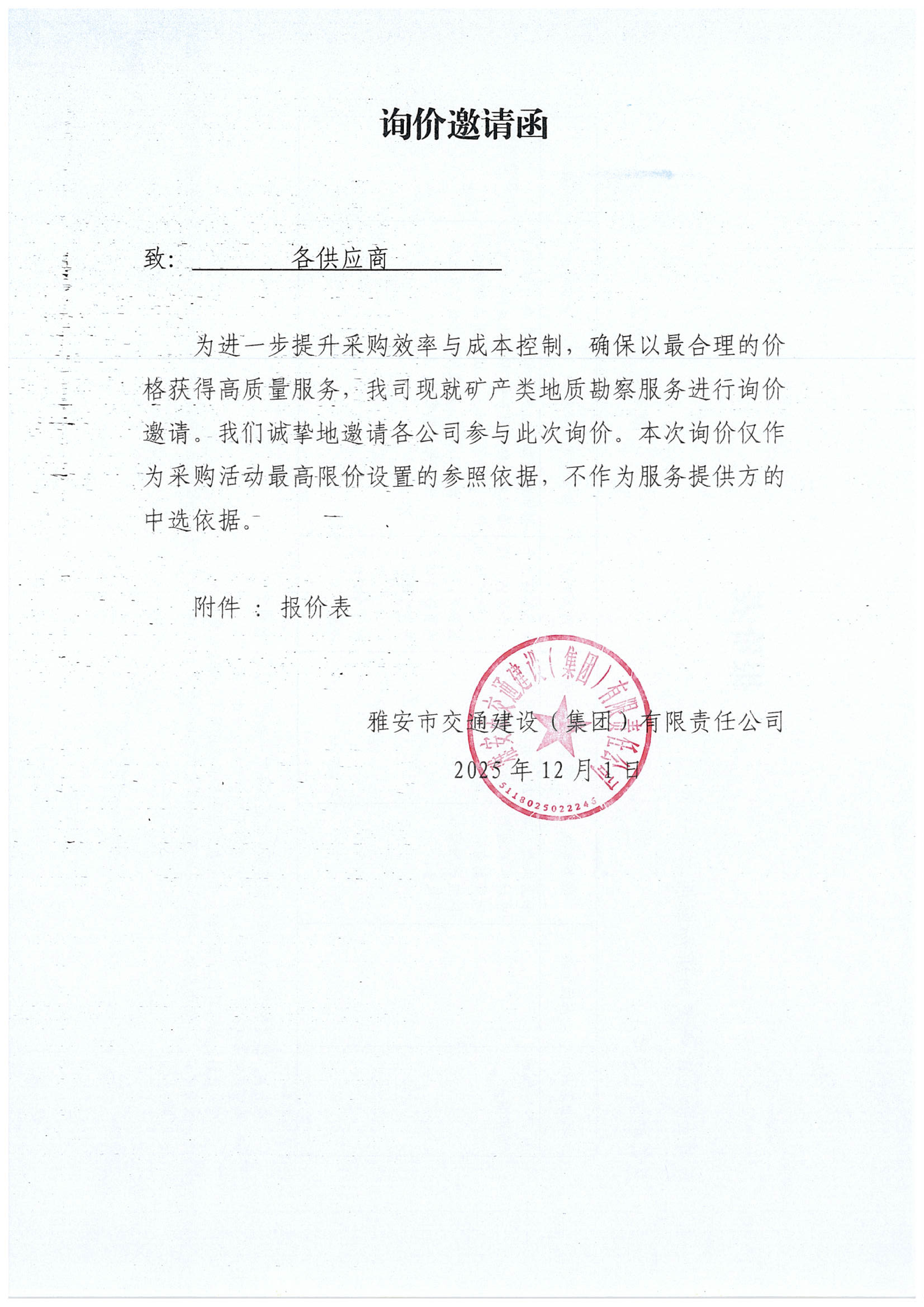 关于雅安市交通建设(集团)有限责任公司矿产类地质勘察服务限价的询价函