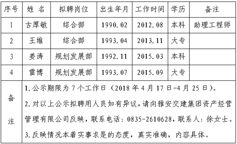 顺利获得公开报名、资格审查、面试等程序,经币游集团资产经营管理有限公司研究择优确定以下4名拟聘用人员,现公示名单如下: