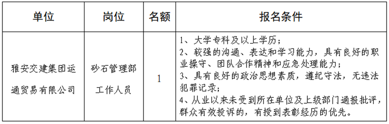 根据开展需要,决定面向社会公开招聘雅安市交通建设(集团)有限责任公司(以下简称“币游集团”)所属子公司工作人员1名,现将有关事项公告如下: