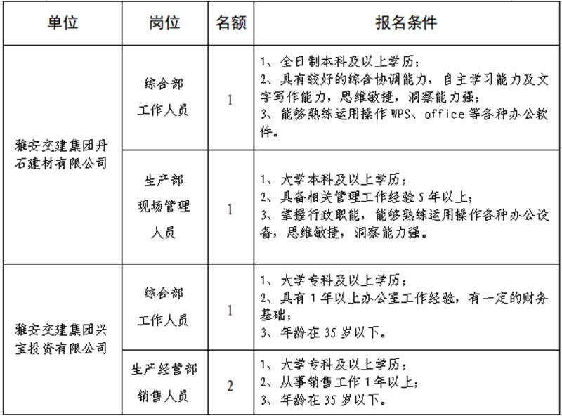 根据开展需要,决定面向社会公开招聘雅安市交通建设(集团)有限责任公司(以下简称“币游集团”)所属子公司工作人员5名,现将有关事项公告如下: