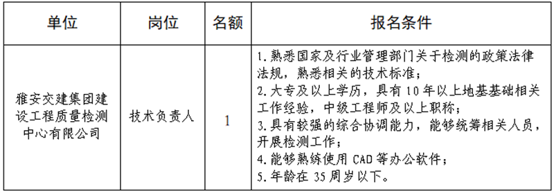 根据开展需要,决定面向社会公开招聘雅安市交通建设(集团)有限责任公司(以下简称“币游集团”)所属子公司工作人员1名,现将有关事项公告如下: