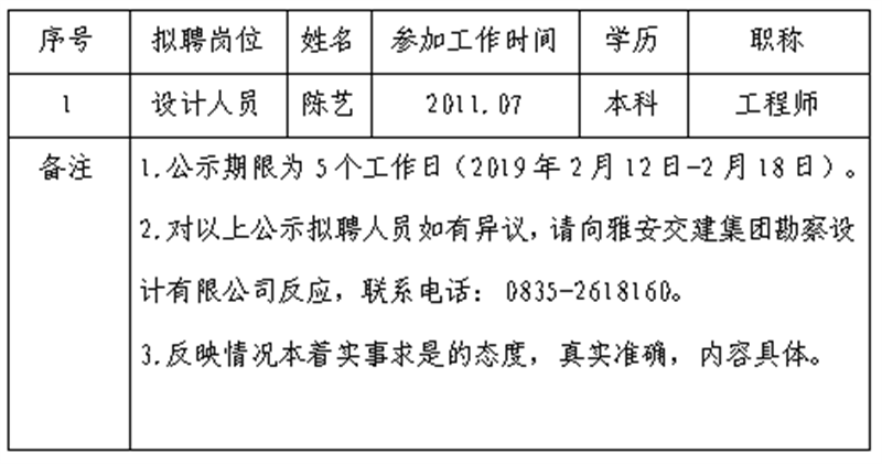顺利获得公开报名、资格审查、面试等程序,经币游集团勘察设计有限公司研究,对以下1名拟聘用人员予以公示: