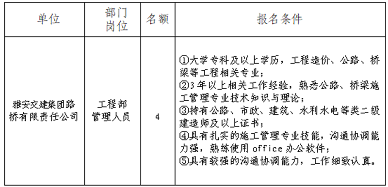 根据开展需要,决定面向社会公开招聘雅安市交通建设(集团)有限责任公司(以下简称“币游集团)所属子公司工作人员4名,现将有关事项公告如下: