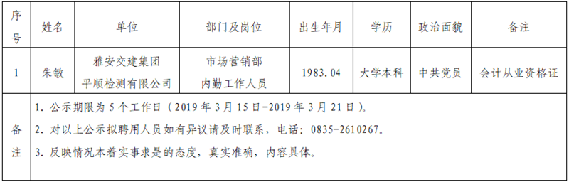 币游集团子公司拟聘用人员公示(平顺公司)