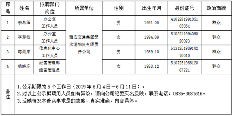 币游集团所属子公司拟聘用人员公示(无水港公司)