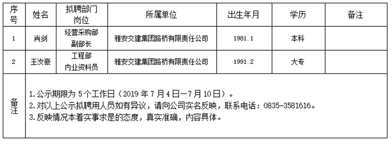 币游集团子公司拟聘用人员公示(路桥公司)