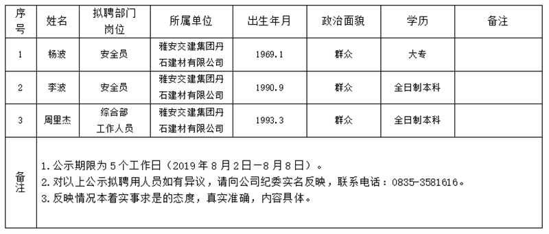 根据集团公司《人才选聘实施办法》,通过资格审查、综合测试、体检、考察等程序,对以下拟聘用人员予以公示: