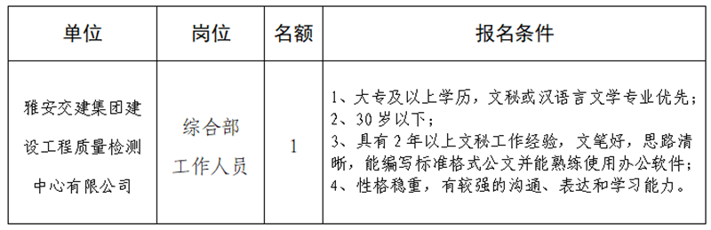 根据开展需要,决定面向社会公开招聘雅安市交通建设(集团)有限责任公司(以下简称“币游集团”)所属子公司工作人员1名,现将有关事项公告如下:
