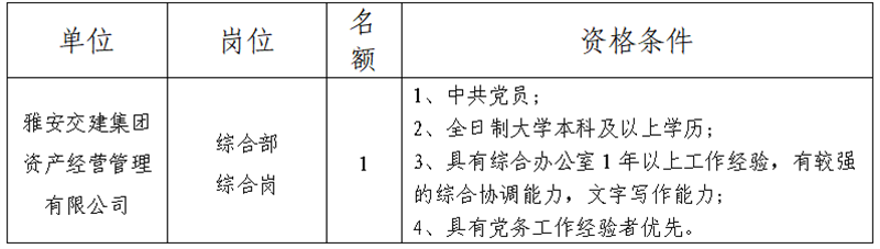 根据开展需要,决定面向社会公开招聘雅安市交通建设(集团)有限责任公司(以下简称“币游集团”)所属子一般工作人员1名,现将有关事项公告如下: