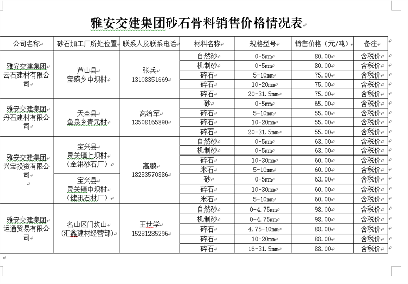 币游集团砂石骨料销售报价表