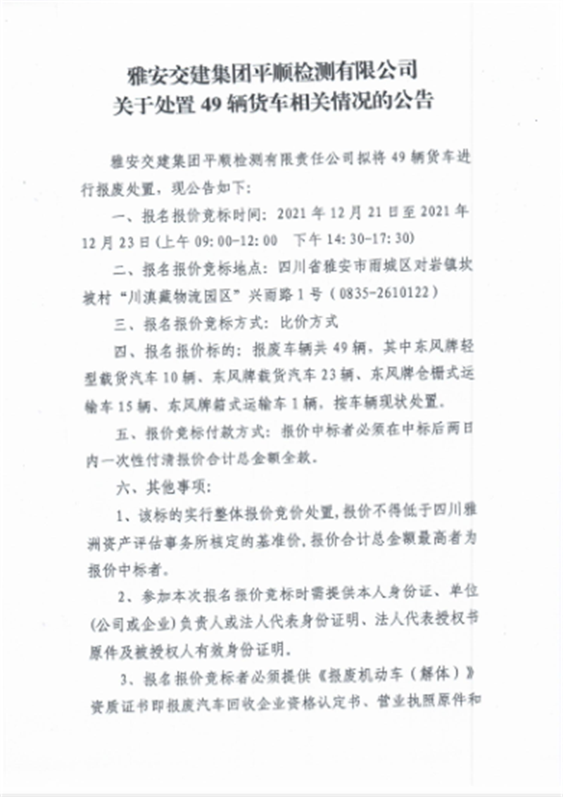 币游集团平顺检测有限公司 关于处置49辆货车相关情况的公告