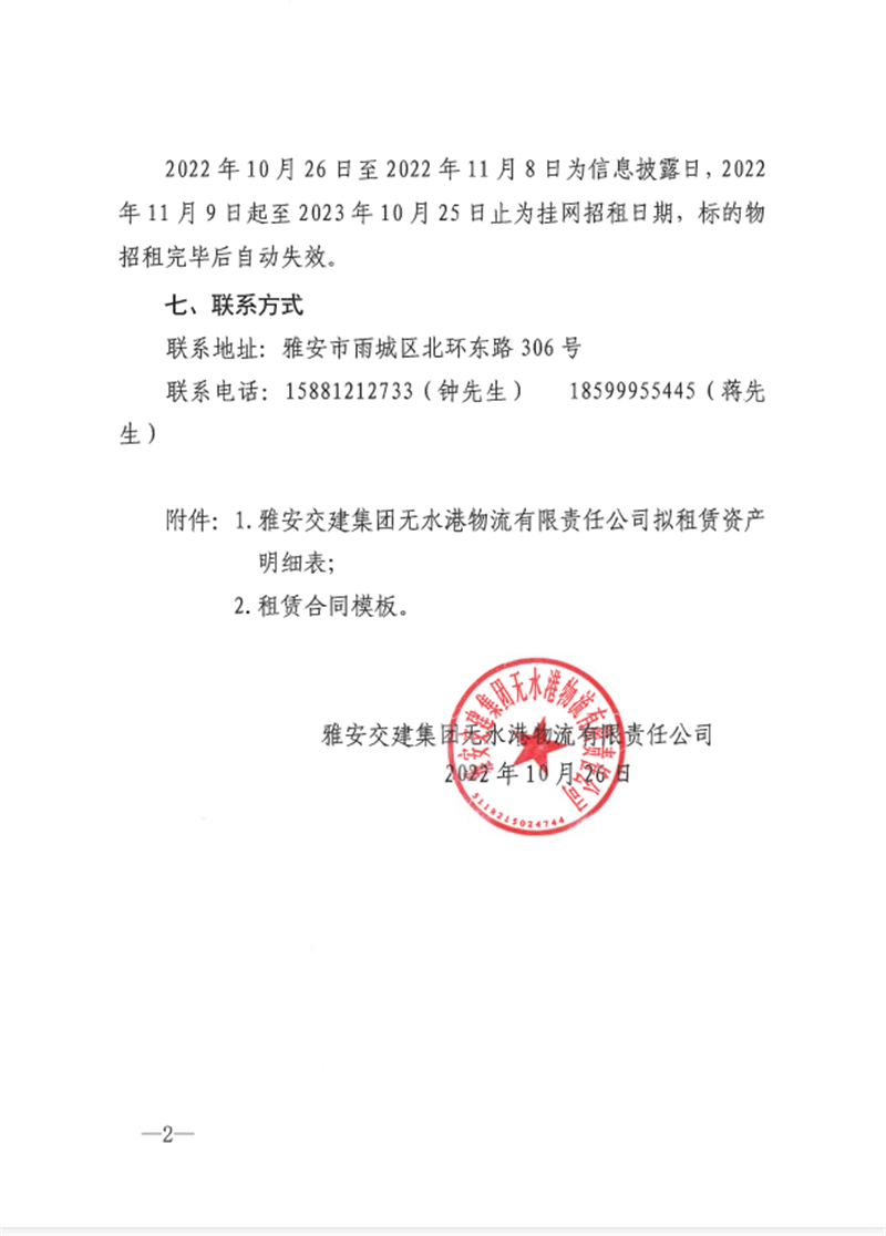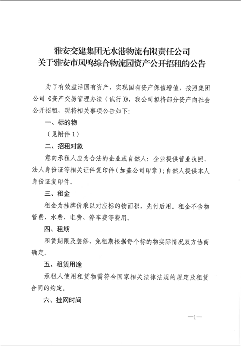 币游集团无水港物流有限责任公司关于雅安市凤鸣综合物流园资产公开招租的公告