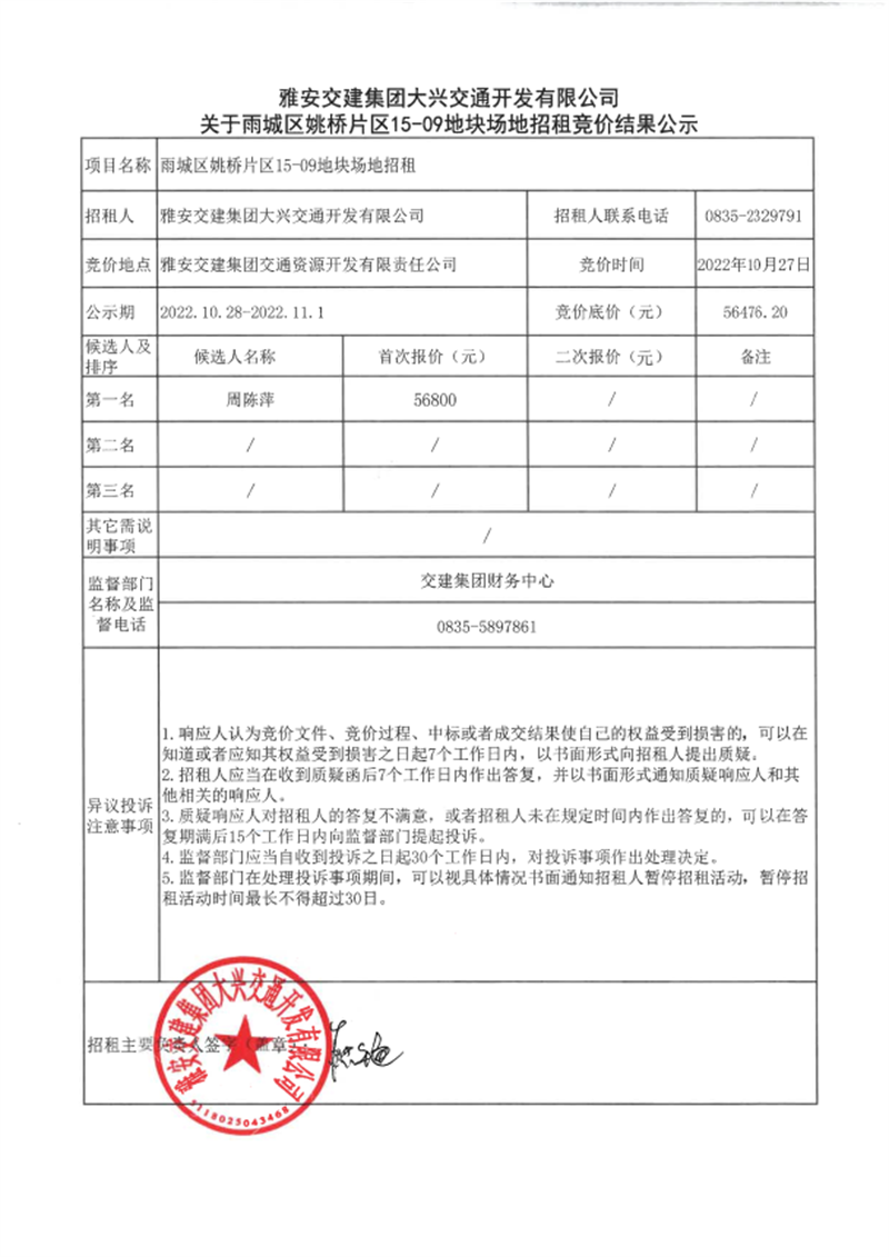币游集团大兴交通开发有限责任公司关于雨城区姚桥片区15-09地块场地招租竞价结果公示