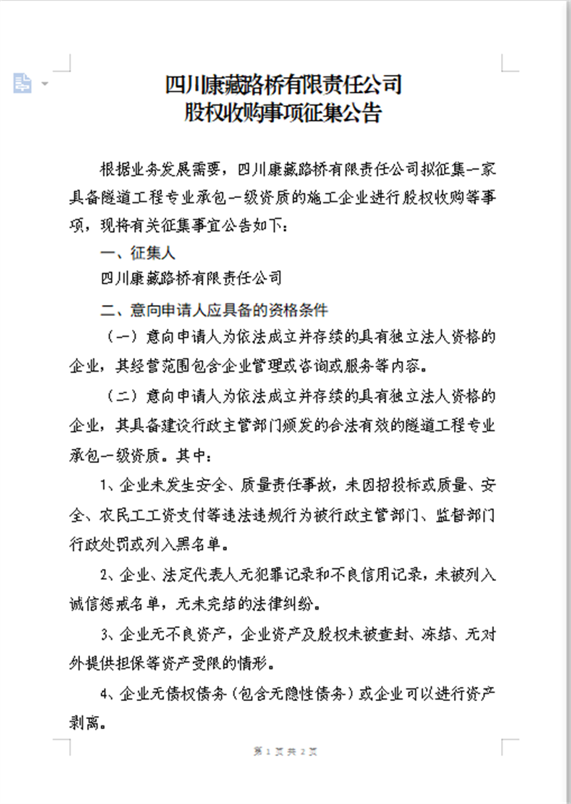 四川康藏路桥有限责任公司 股权收购事项征集公告