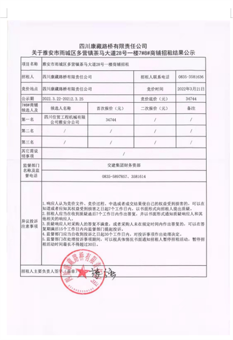 四川康藏路桥有限责任公司关于雅安市雨城区多营镇茶马大道28号一楼7#8#商铺招租结果公示