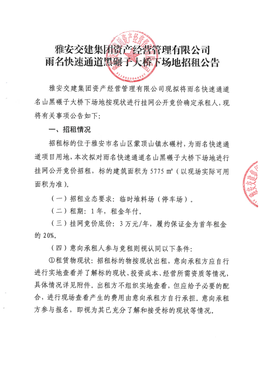四川康藏路桥有限责任公司关于雅安市雨城区北环东路站前广场地下空间商铺招租的公告