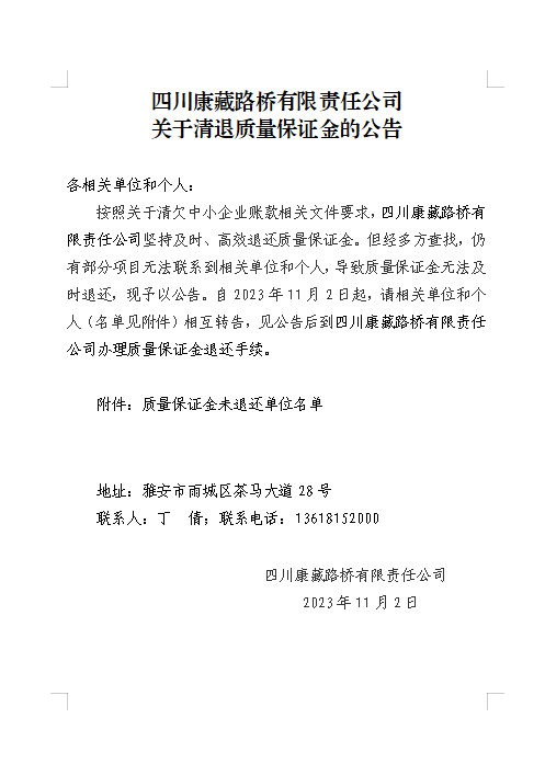 四川康藏路桥有限责任公司关于清退质量保证金的公告