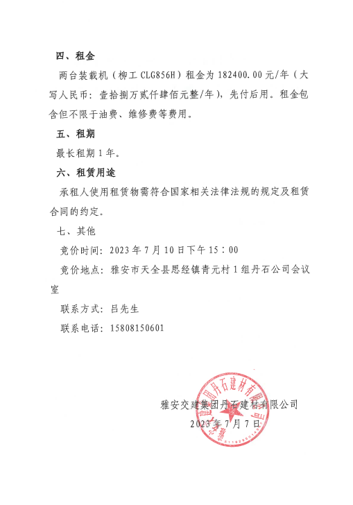 币游集团丹石建材有限公司关于2台装载机公开招租的公告附件