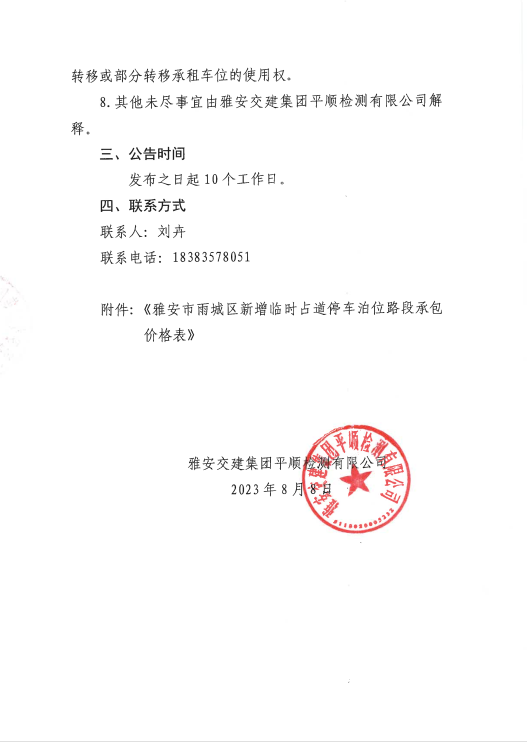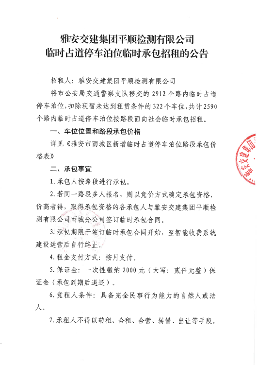 币游集团平顺检测有限公司临时占道停车泊位临时承包招租的公告