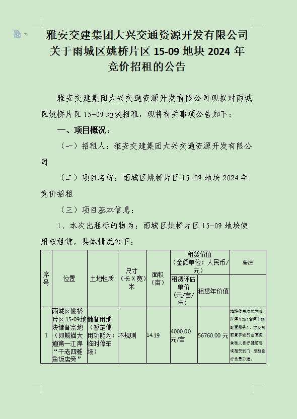 币游集团大兴交通资源开发有限公司关于雨城区姚桥片区15-09地块2024年竞价招租的公告
