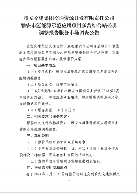 币游集团交通资源开发有限责任公司雅安市氢能源示范应用项目多营综合站控规调整报告服务市场调查公告
