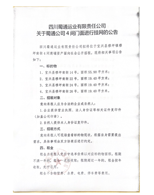 四川蜀通运业有限责任公司关于蜀通公司4间门面进行挂网的公告