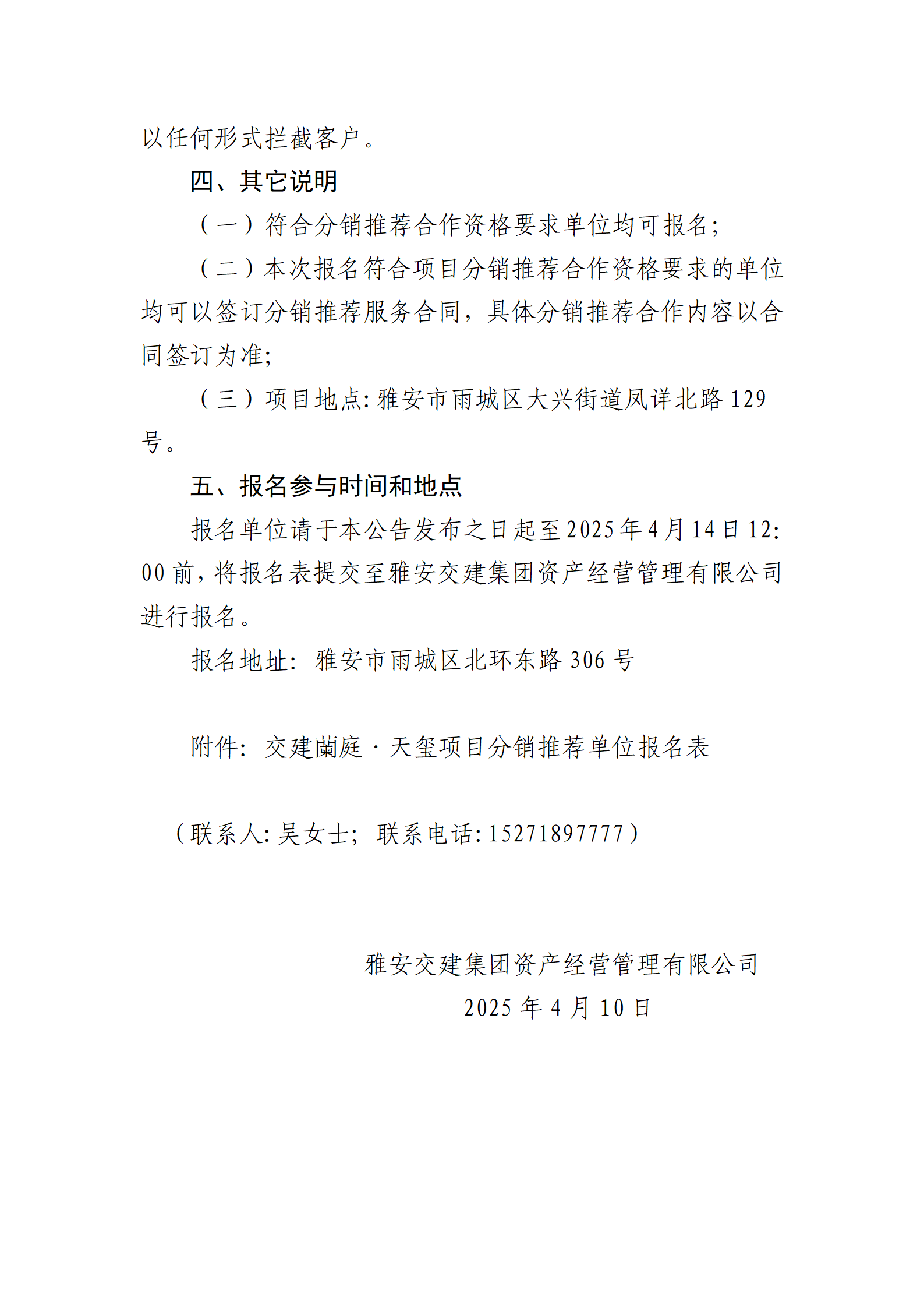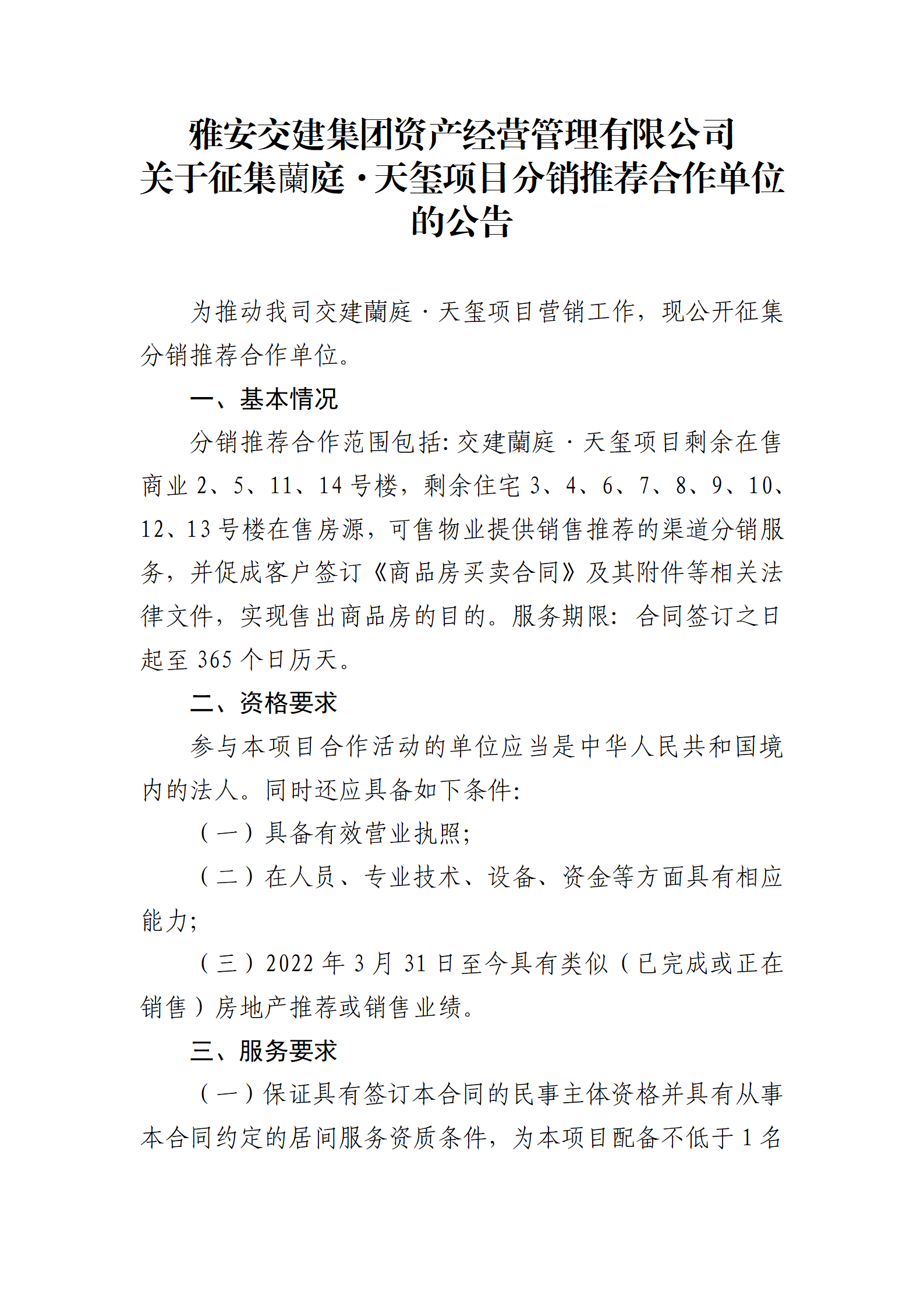 币游集团资产经营管理有限公司 关于征集蘭庭·天玺项目分销推荐合作单位的公告
