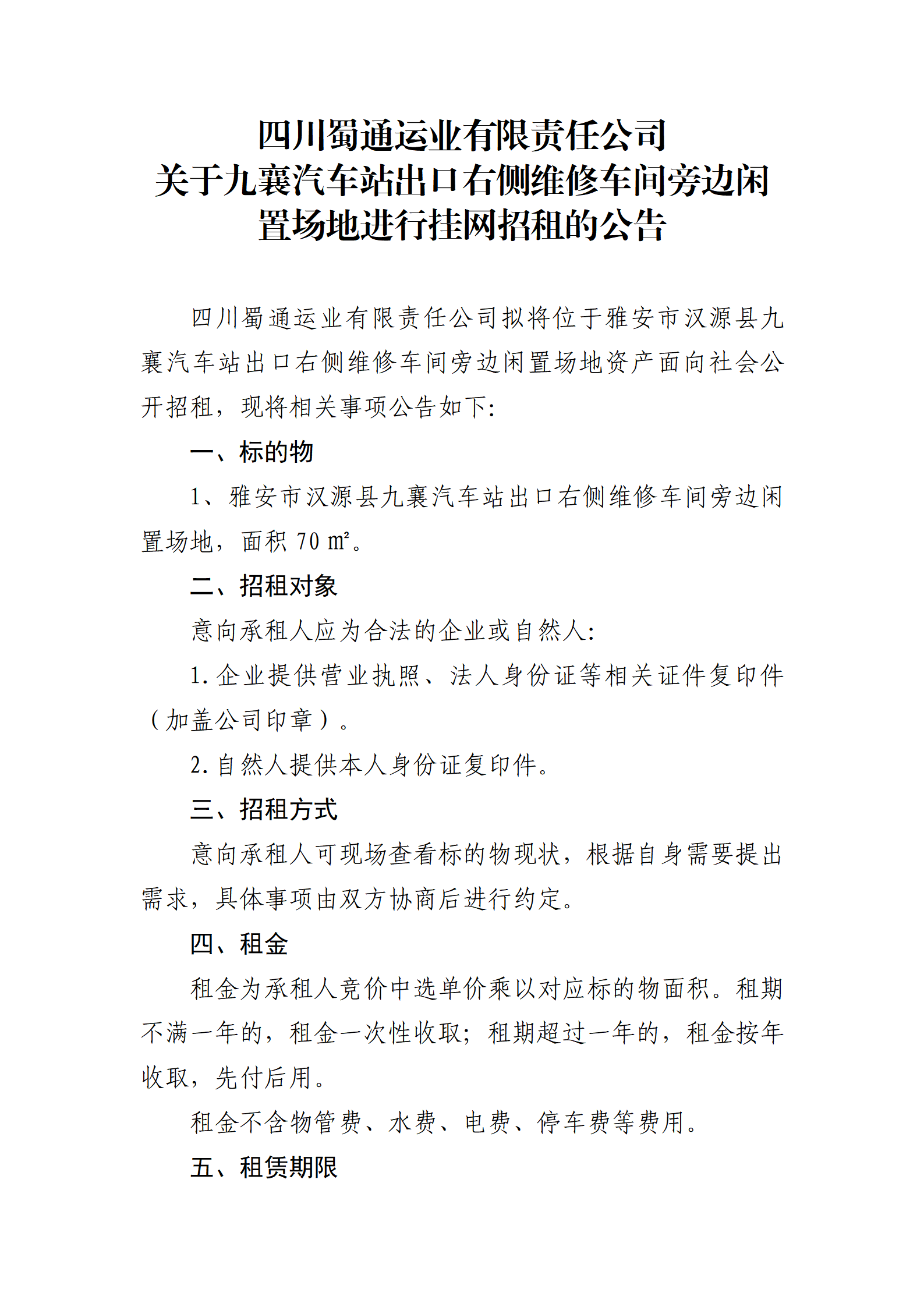 四川蜀通运业有限责任公司 关于九襄汽车站出口右侧维修车间旁边闲置场地进行挂网招租的公告