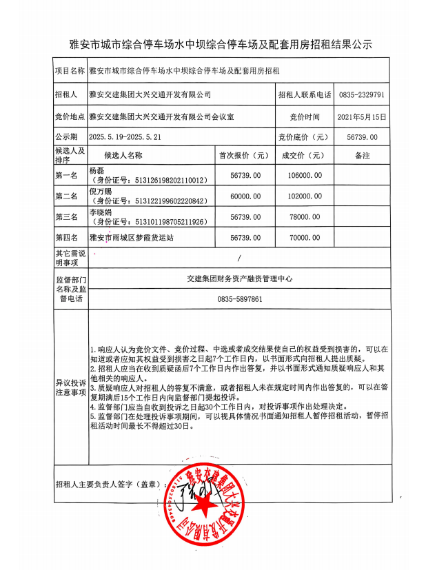 雅安市城市综合停车场水中坝综合停车场及配套用房招租结果公示