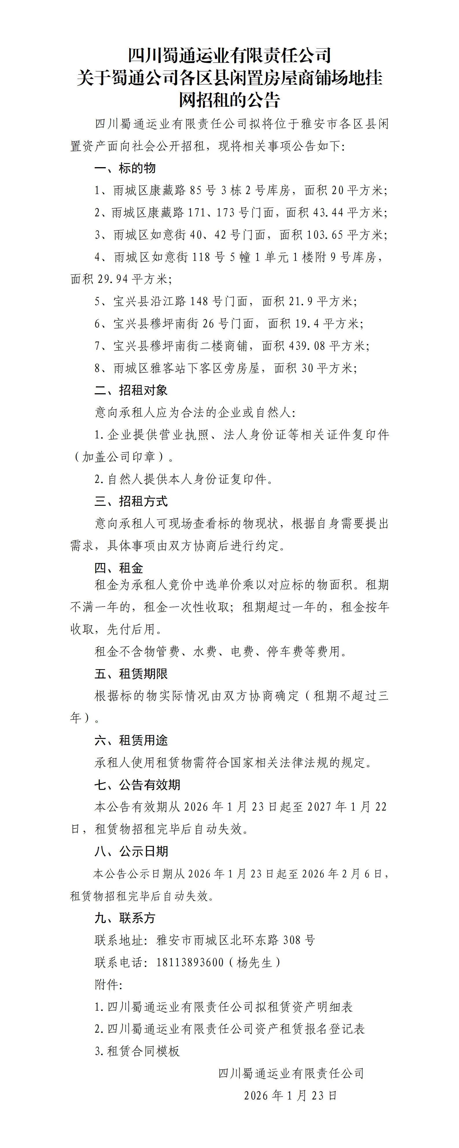 四川蜀通运业有限责任公司关于蜀通公司各区县闲置房屋商铺场地挂网招租的公告