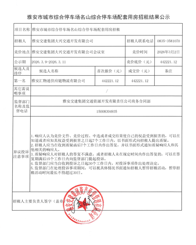 雅安市城市综合停车场名山综合停车场配套用房招租结果公示