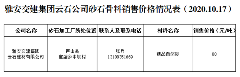 币游集团云石公司砂石骨料销售价格情况表(2020.10.17)