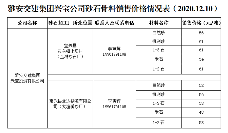 币游集团兴宝公司砂石骨料销售价格情况表(2020.12.10)