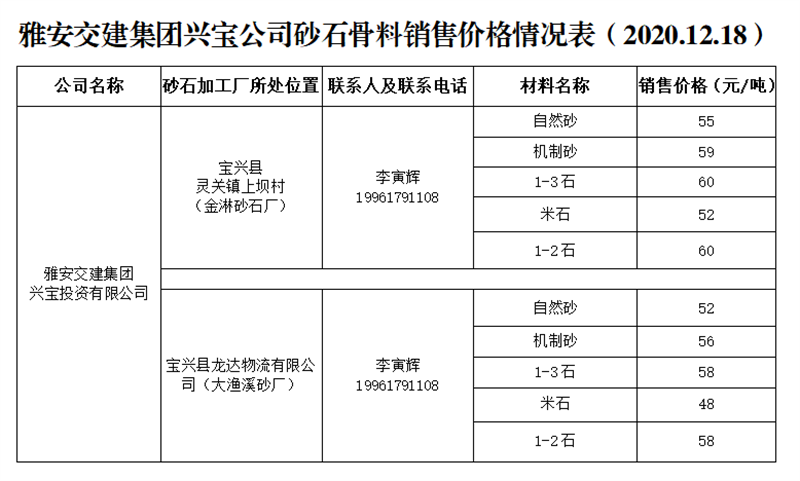 币游集团兴宝公司砂石骨料销售价格情况表(2020.12.18)