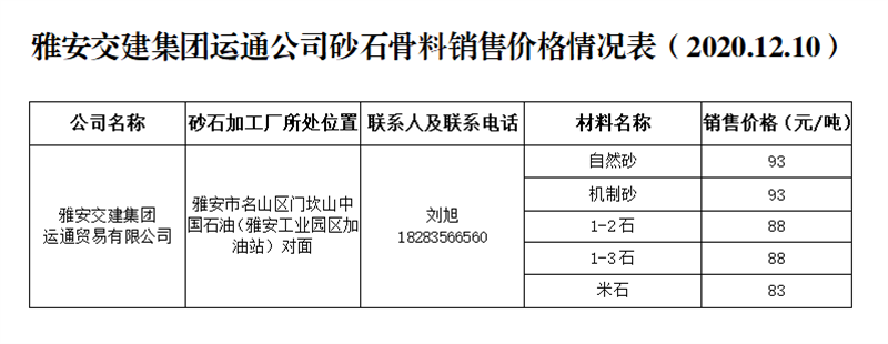 币游集团运通公司砂石骨料销售价格情况表(2020.12.10)