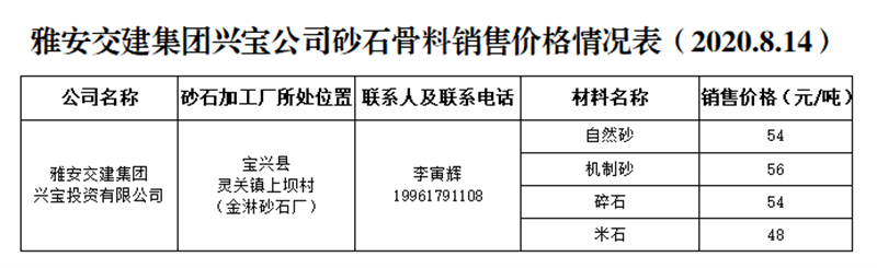 币游集团兴宝公司砂石骨料销售价格情况表(2020.8.14)