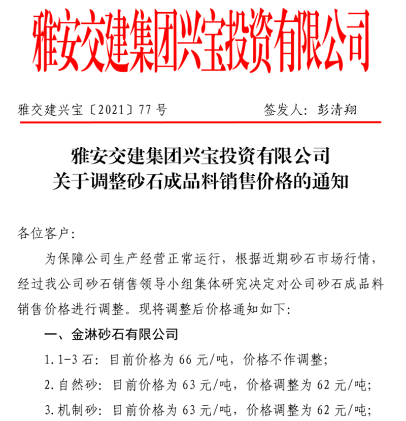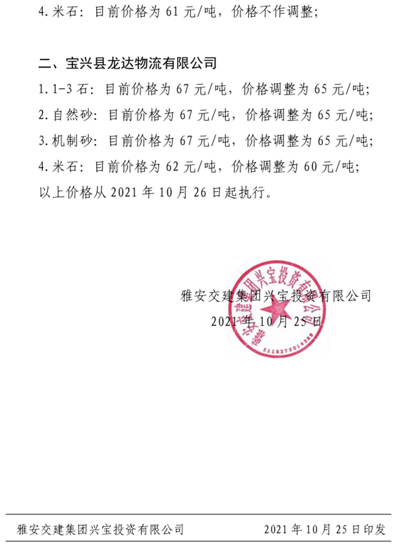币游集团丹石公司关于调整成品骨料及风化矿石料销售价格的通知(2021.10.26)