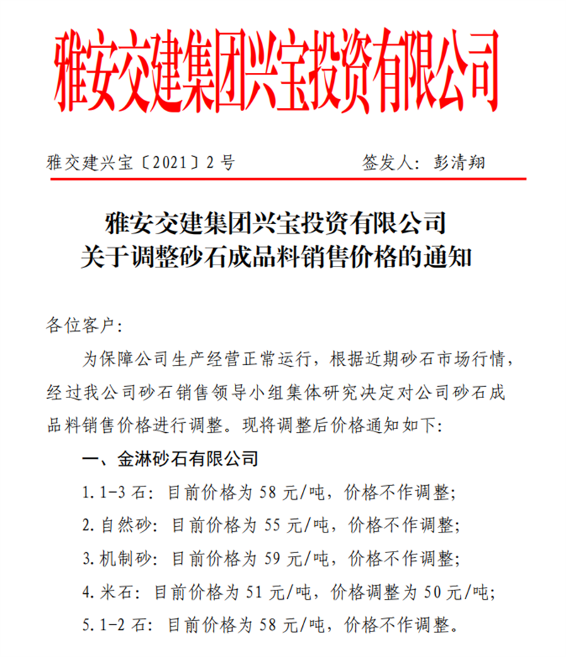 币游集团兴宝公司砂石骨料销售价格情况表(2021.1.14)